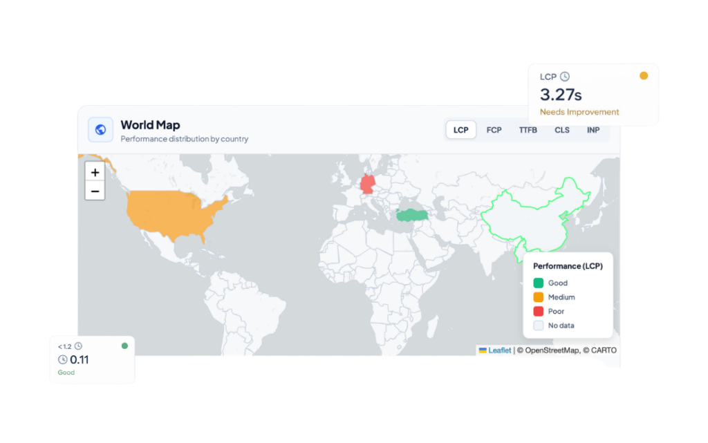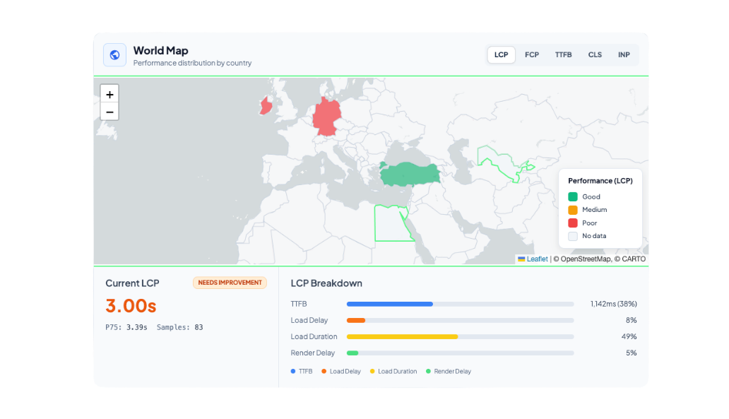 Measure your website’s performance by country and city with analytics based on real user data. Deliver a faster and more optimized experience in every market by meticulously tracking loading times, Core Web Vitals metrics, and user experience across different geographies.